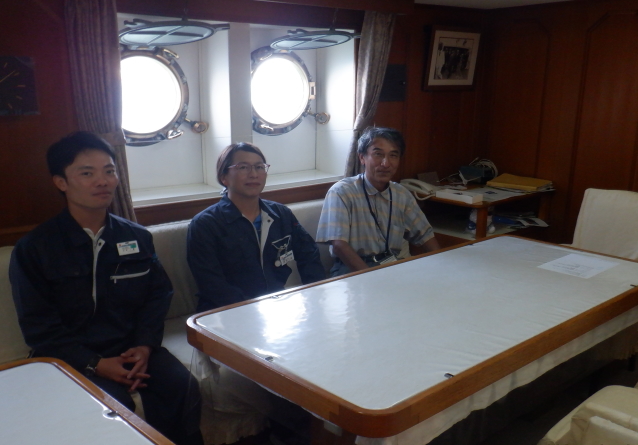 写真 海王丸船長公室にて(大井一等航海士・野田機関長・河合) |