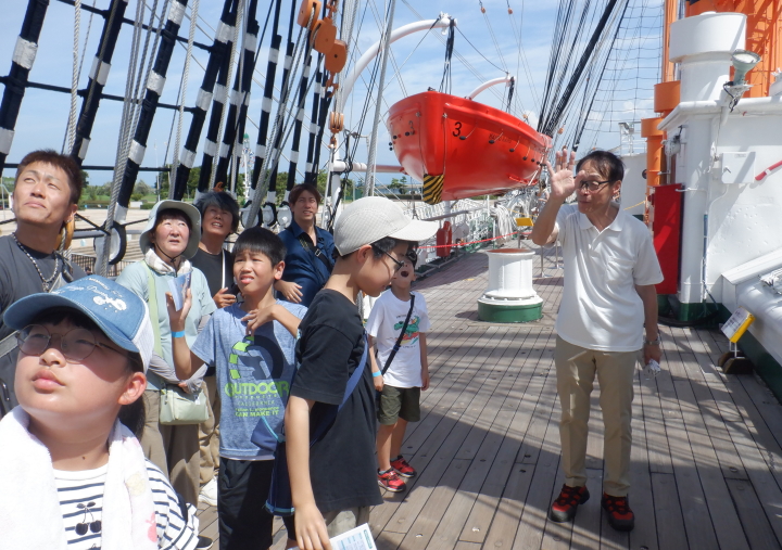 1.日時:2025年 8月17日(日) 受付 12時30分〜13時(海王丸パーク日本海交流センター) 見学会13時〜16時 2.集合場所:海王丸パーク日本海交流センター 3.参加者:小学4年生以上と中学生及び保護者29名 4.スタッフ:國枝佳明,河合雅司(海洋会富山支部) 保前友高,今井敦史,成瀬暁恵(富山高専教職員) 主催:富山高等専門学校・海洋会富山支部 協力:(独)海技教育機構, 伏木富山港・海王丸財団 参加者を2班(A班:17名,B班:12名)に分けて新・旧海王丸の見学を 実施した。新海王丸は岩崎船長、野田機関長、大井一等航海士に 説明して頂き、旧海王丸は海洋会富山支部の國枝富山高専校長に 説明して頂いた。非常に暑い日であったが、國枝校長、岩崎船長、 野田機関長、大井一等航海士から非常に丁寧で分かりやすい説明が あり、また、参加者から「新海王丸の係留索に猫の絵を描いた 金属板(ラットガード)が付いているがあれは何か?」等の積極的な 質問が数件あり、非常に有意義な見学会になった。 |