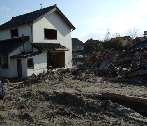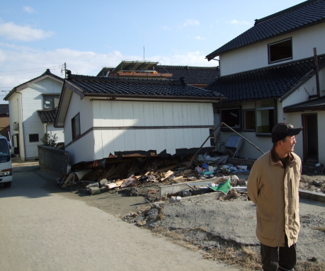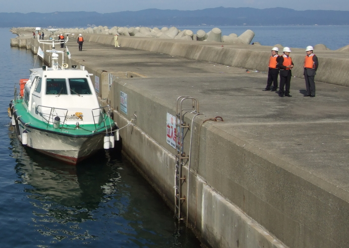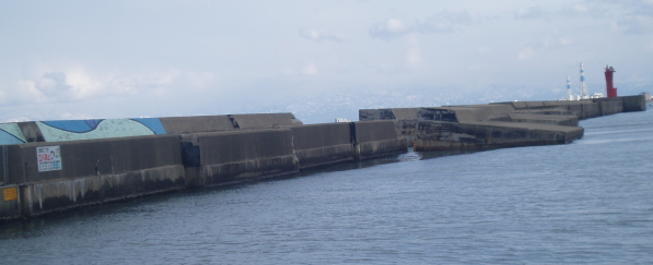 伏木富山港(伏木地区)北防波堤 (2008年 3月 4日撮影) 長さ約800mに渡り最大12m移動 (ケーソン:2500屯,ケーソン+砂:4200屯) |
