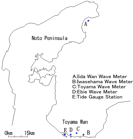 ☆飯田湾(A),岩瀬浜(B), 海老江(D) 0.5秒毎に水圧による水位データを連続観測 ☆富山(C) 0.5秒毎に超音波と水圧による水位データを連続観測 ☆富山新港(E) 1秒毎に水圧による水位データを連続観測 |