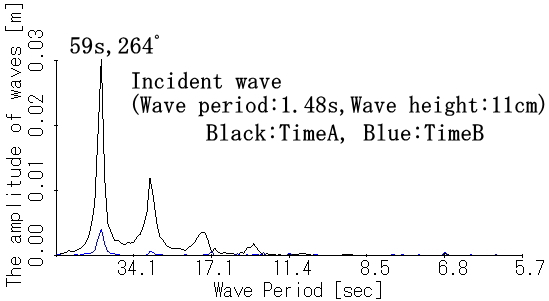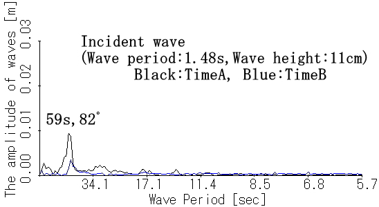水槽(長さ:45.23m,幅:5.6m), 通常沿岸を想定 水平浅瀬域で固有振動が生じるかどうか検証 ☆実験方法 規則波(周期1.48秒, 波高7cm,9cm,11cm)を 16分間造波し、0.05秒毎に波高計で水位を観測。 ☆想定縮尺:1/100 ☆解析データ 造波装置を動かした16分間(960秒間)19200個のデータ のうち、16384個(819.2秒間)のデータを使用した。 (a)時間A(Time A):0〜819.2秒まで (b)時間B(Time B):140.8〜960秒まで |