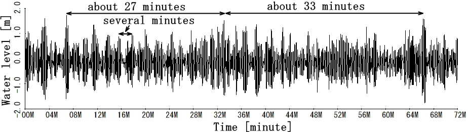 ここで、数分周期の波は、うねり性波浪により沿岸の水平浅瀬域で駆動されたもの