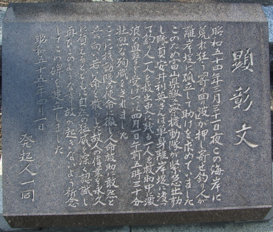 1979年03月31日22時50分頃、滑川市高月海岸の離岸堤に愛知 県の釣り人4人が取り残され、滑川署が対策本部を設置して、 救助にあたったが04月01日未明までに一人が死亡、二人が行方 不明になり、釣り人1人が救助された。更に、救助にあたった 富山県警機動隊員1人が死亡した。